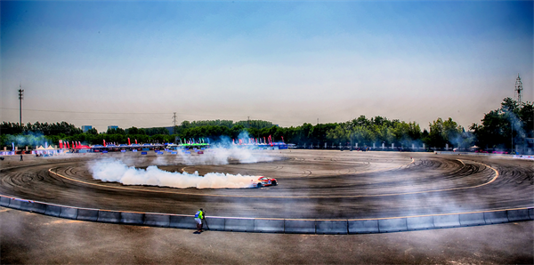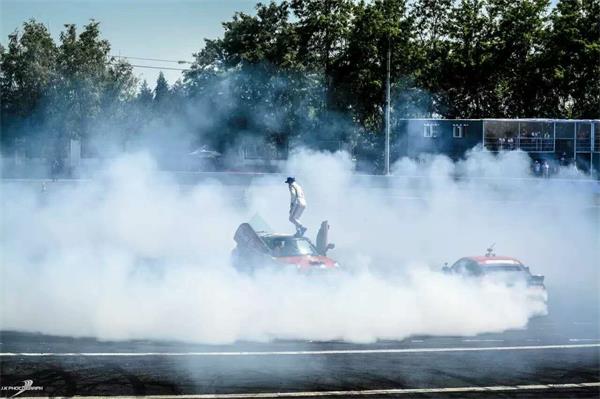 本站开幕式现场,韩岳携手零公里润滑油CDF车队队友苏志尧、张盛钧一同为大家带来了精彩的汽车特技表演,并首次上演了双车卫星绝技。