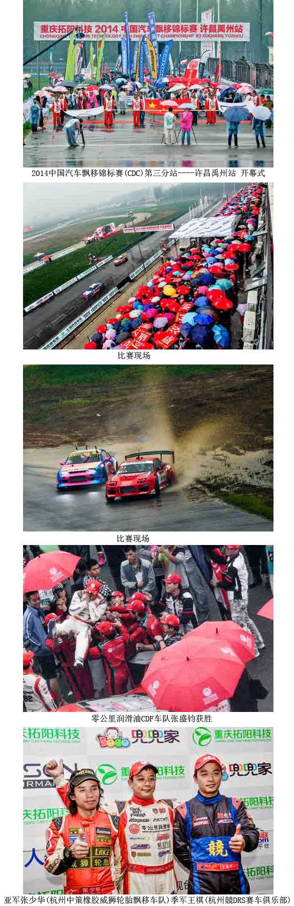 开幕式上,发动机咆哮着驶入赛道,向全场观众打招呼,尽管雨不停的在下着,但丝毫也挡不住观众激动的心情。看台上挤满了五颜六色的雨伞。本次赛事采用残酷的两轮PK方式,胜者晋级,负者直接淘汰。经过三天层层晋级,14号晚上的总决赛中,最终,零公里润滑油CDF车队张盛钧,站到了车手冠军奖杯的跟前,零公里润滑油CDF车队也凭借这一站总积分高举榜首,而捧得车队杯!